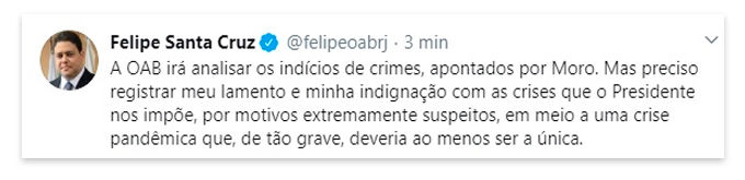 "Foram muito graves as declarações do ministro Sergio Moro ao comunicar sua demissão, indicando possíveis crimes por parte do presidente da República. Solicitei à Comissão de Estudos Constitucionais da OAB um estudo detalhado do pronunciamento e suas implicações jurídicas. É lamentável que, no dia seguinte ao país registrar mais de 400 mortos pela pandemia, estejamos todos em meio a nova crise patrocinada pelo governo."